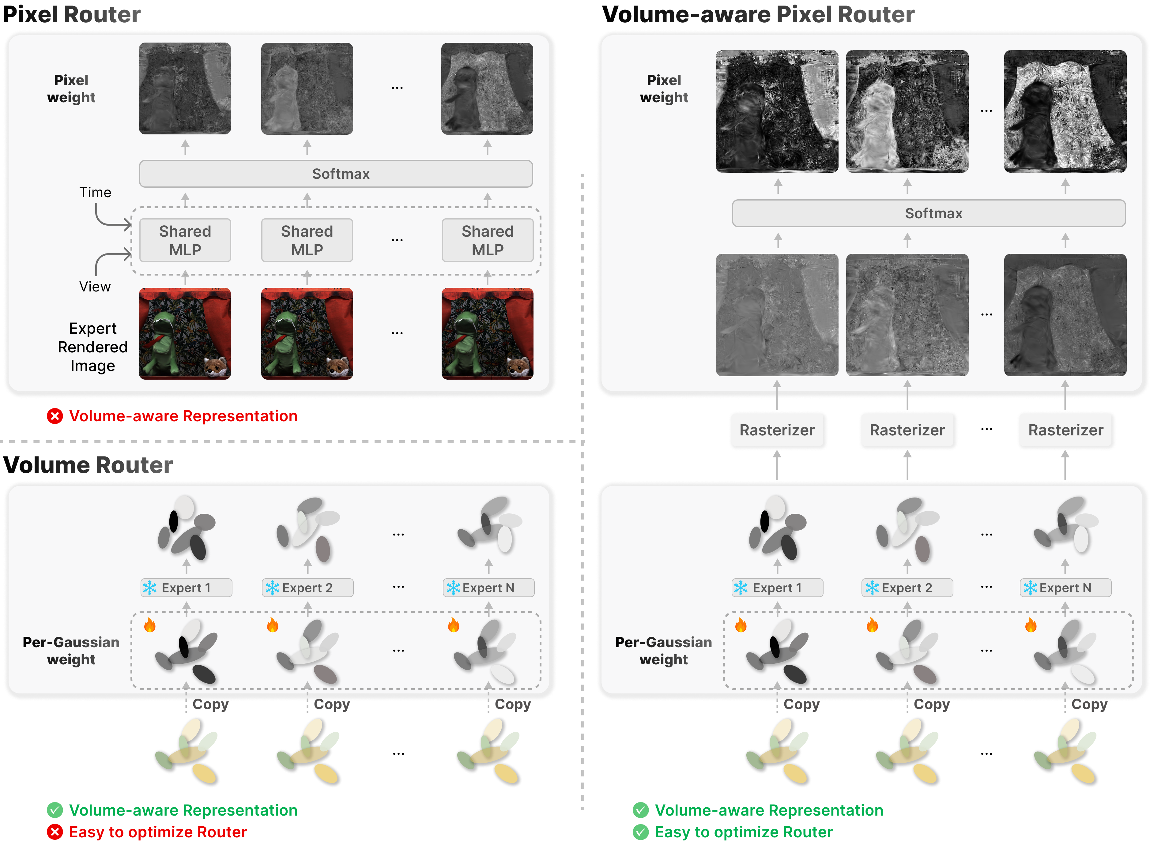We introduce the Volume-aware Pixel Router, which overcomes the limitations of naive pixel-level (top-left) and unstable 3D-level routing (bottom-left) by combining learnable per-Gaussian weights, volumetric attributes, and rasterization-based weight splatting. This enables temporally and view-consistent, volumetrically informed, and stably optimized expert blending.