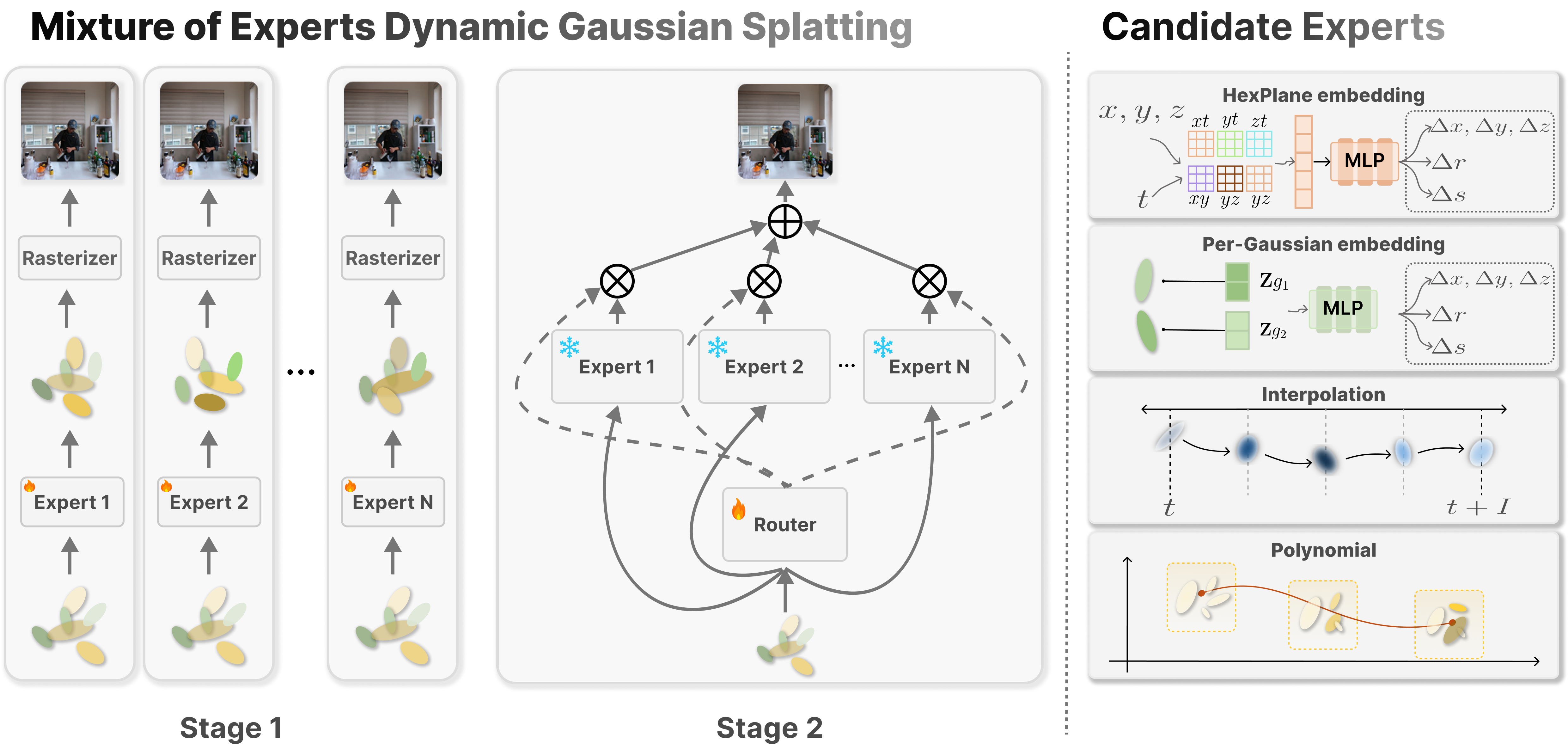 MoE-GS follows a classic Mixture-of-Experts design to address dynamic scene reconstruction. In Stage 1 (Expert Training), each expert is independently trained to reconstruct dynamic scenes by learning its own Gaussian representation. In Stage 2 (Router Training), expert parameters are frozen, and the Volume-aware Pixel Router is optimized to compute adaptive spatial and temporal gating weights for blending expert outputs. The right shows candidate expert types—including HexPlane embedding-based, Per-Gaussian embedding-based, reformulation-based, interpolation-based, and polynomial-based models—each capturing different dynamic behaviors.